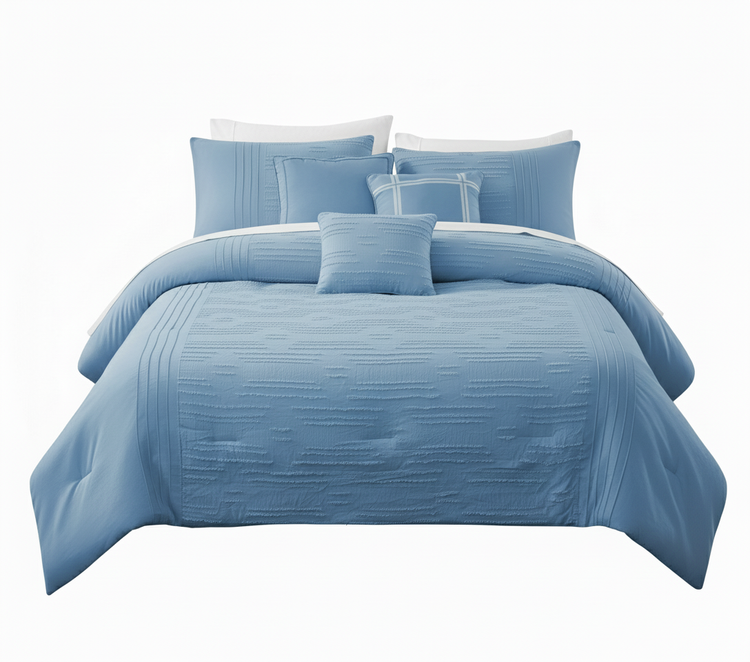 This comprehensive bedding ensemble features sophisticated clipped jacquard fabric with an elegant dash pattern that adds subtle texture and visual interest to any bedroom décor.