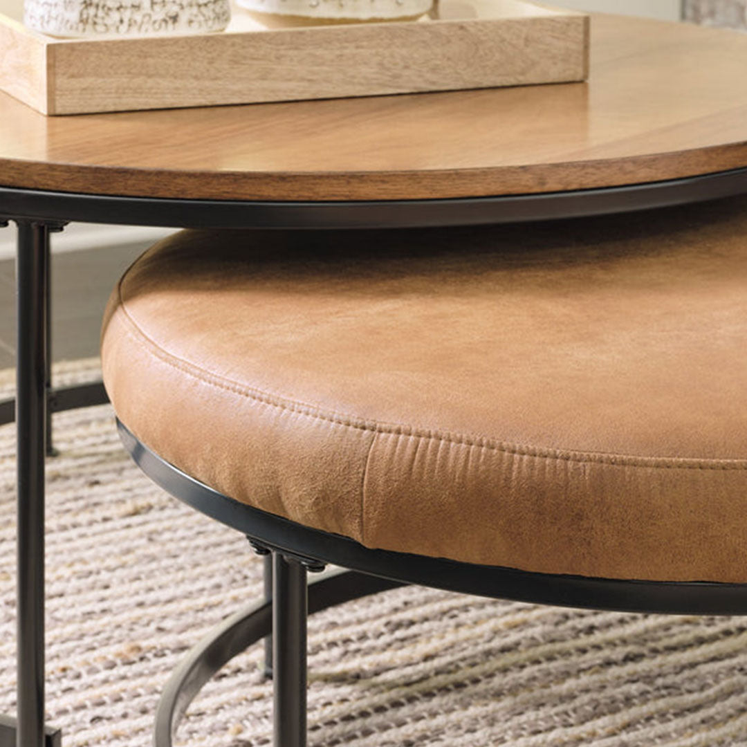 La chapa de mango marrón claro de la mesa combina maravillosamente con la otomana de cuero sintético color caramelo para lograr un aspecto rústico y refinado que se siente como en casa.