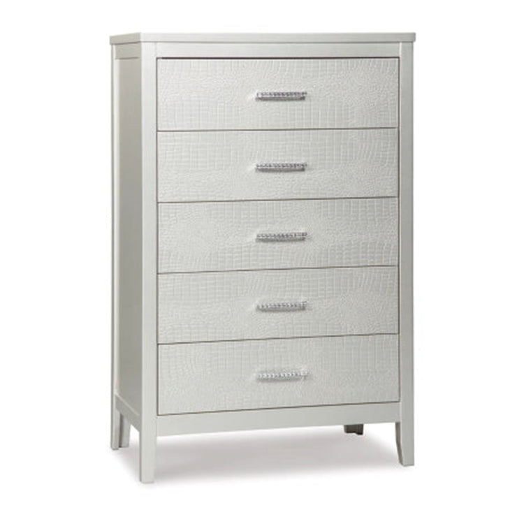 Los frentes de los cajones y el panel del pie de cama con textura en relieve tienen un aspecto "glamoroso" moderno. El panel del cabecero presenta una cubierta de cuero sintético gris con mechones de diamantes y botones con apariencia de cristal.