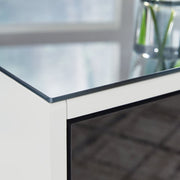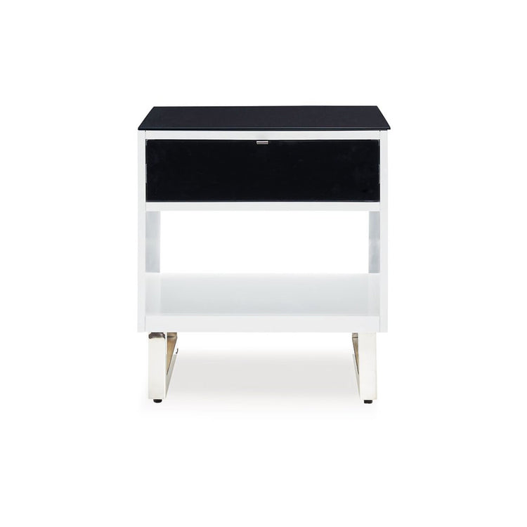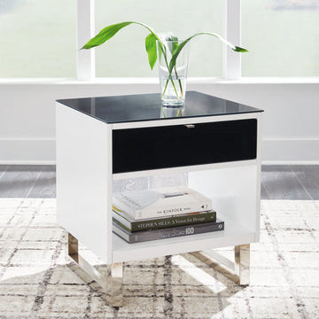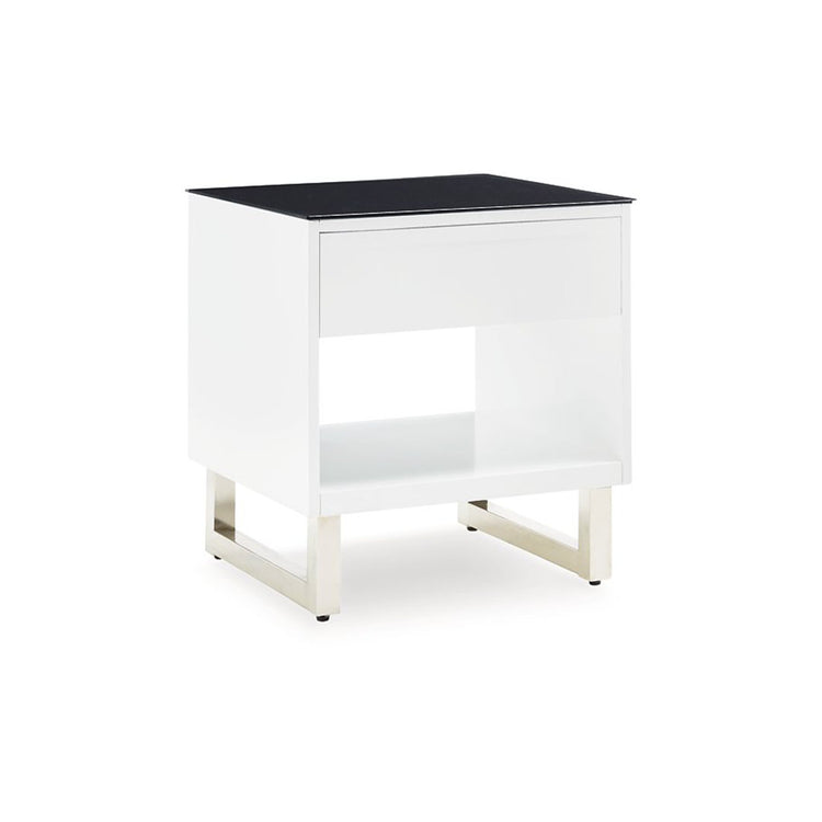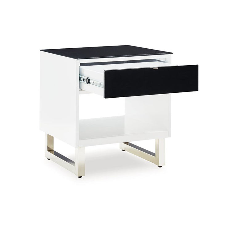 The Gardoni End Table seamlessly blends modern aesthetics with practical functionality. Featuring a high-gloss white finish contrasted by a sleek black glass tabletop, this piece exemplifies contemporary design.