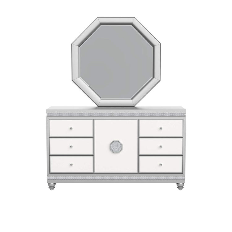 With its large square reflective surface and eye-pleasing frame finished in white/gray or blue tones with elegant silver/blue detailing, this mirror is designed to amplify light, enhance visual space, and serve as a refined centerpiece above a dresser or on any wall.
