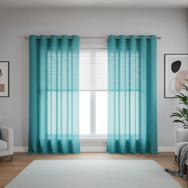These luxurious sheer metallic curtain panels feature elegant grommet tops and a subtle shimmer that catches and reflects light beautifully throughout the day.