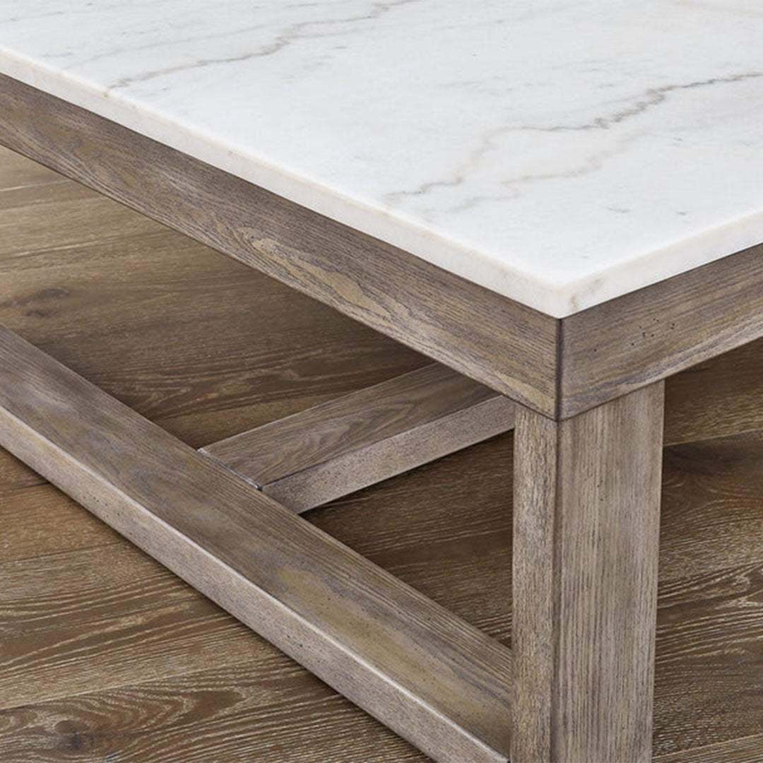 This coffee table is simple in design but big on style. Finished with a trend-right grayish brown wood tone, its blocky profile and natural marble top are timeless classic choices that work so well with large sectional family room settings.