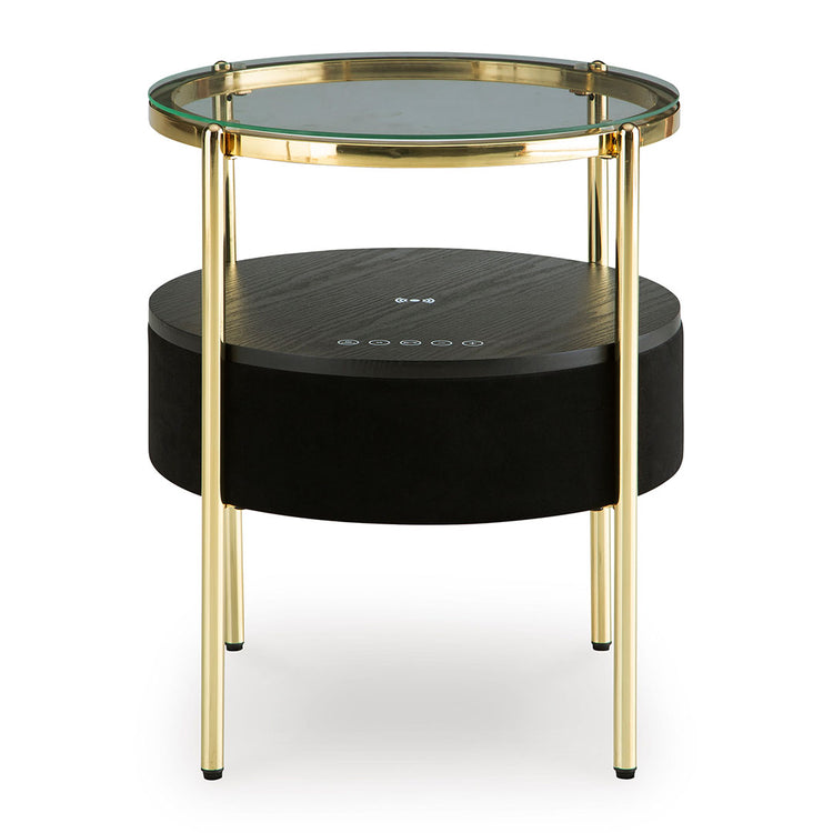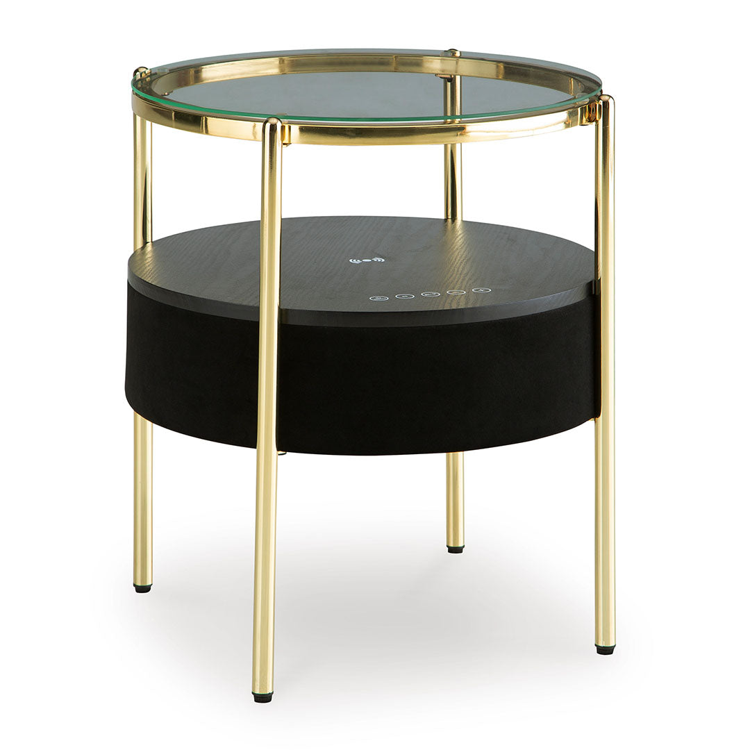 A sleek, contemporary round accent table that doubles as a multimedia centerpiece.