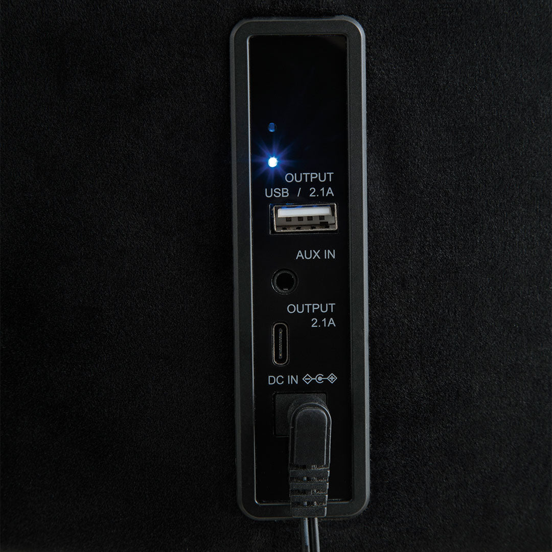 Inside is a built-in speaker system with wireless charging. Perfect for living rooms, bedrooms, or office nooks